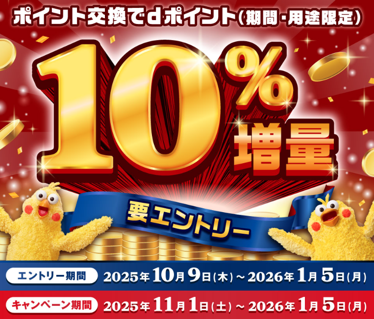 2025年11月1日(土)〜2026年1月5日(月)までの間、dポイント交換10%増量キャンペーンが実施されています。