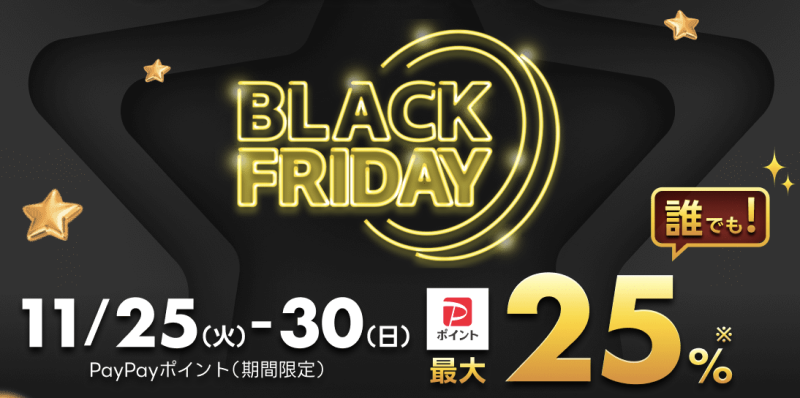 2025年11月25日(火)〜30日(日)の間、2万円以上の決済利用で最大25%のポイント還元になるブラックフライデーが開催されます。※25日の5のつく日は不実施