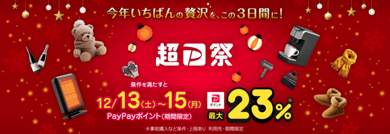 2025年12月13日(土)〜15日(月)の間、2万円以上の決済利用で最大23%のポイント還元になる超PayPay祭が開催されます。※15日の5のつく日は不実施