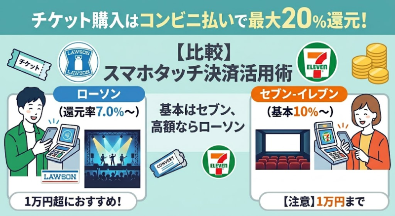 どちらもコンビニ端末で発券・支払いをする際に、スマホのタッチ決済が使えるため、7.0%〜最大20%以上のポイント還元を受けることができます。