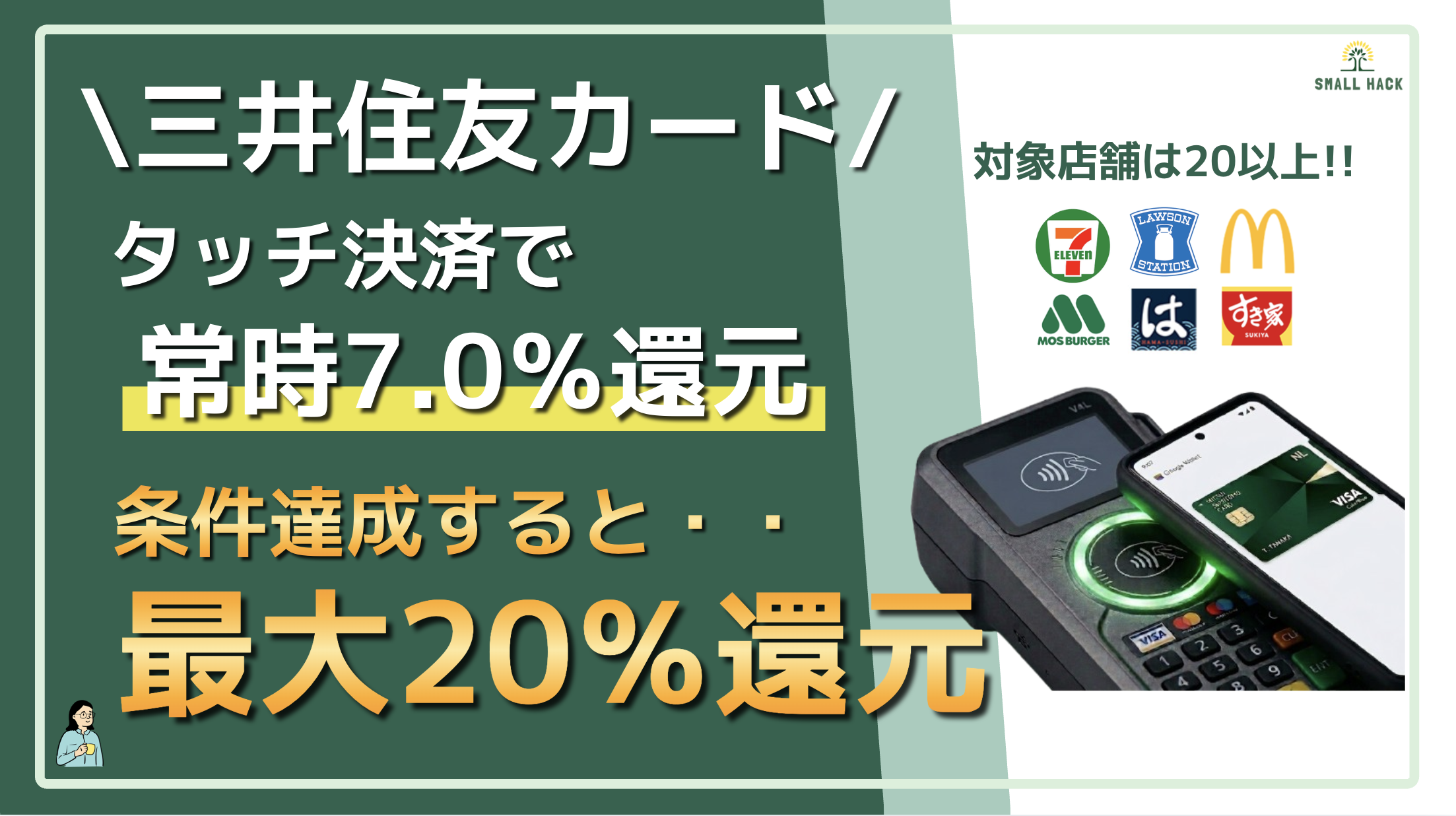 【三井住友カード】タッチ決済で最大20%還元!7.0%以上は確定する対象店舗一覧と条件のまとめ