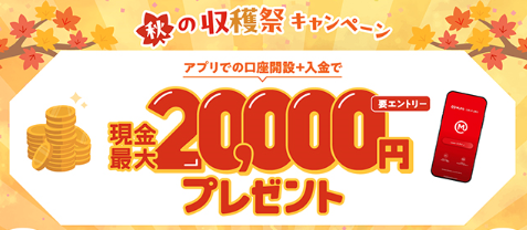 2025年10月6日(月)~11月28日(金)の間、新規口座開設と条件達成で最大20,000円がもらえる秋の収穫祭キャンペーンが実施されています。