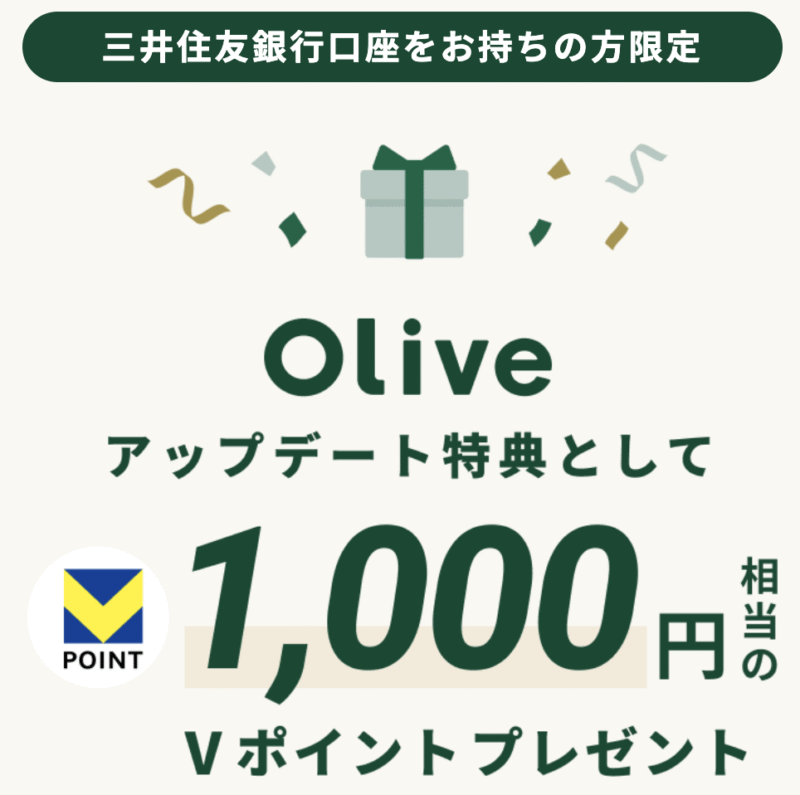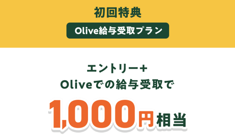 初めて30,000円以上の給与受取をすることで、1,000円分のVポイントがもらえるOlive給与受取プランを実施されています。