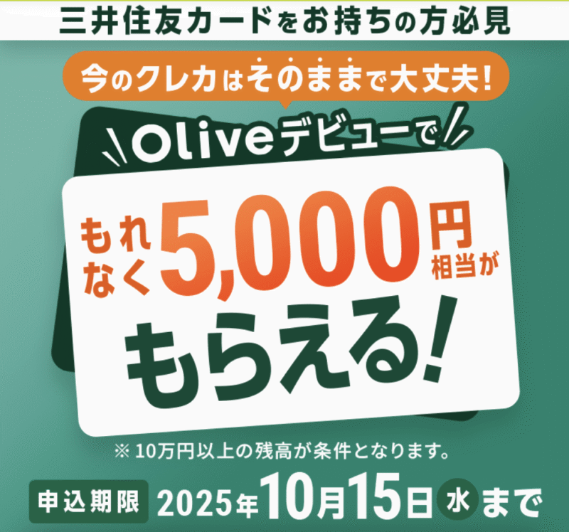 2025年9月16日(火)~10月15日(水)の間、対象の三井住友カード保有者限定で、Oliveアカウントの新規開設 or 切替で5,000PがもらえるOliveデビューキャンペーンが実施されています。