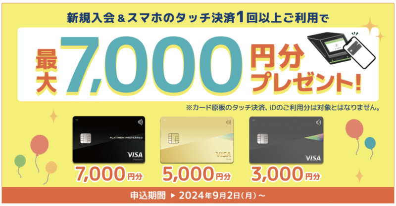特典・付与条件 | クレジットモードで スマホのVisaタッチ決済1回利用 ➡︎ VポイントPayギフト ノーマル:3,000円 ゴールド:5,000円 プラチナP:7,000円 |