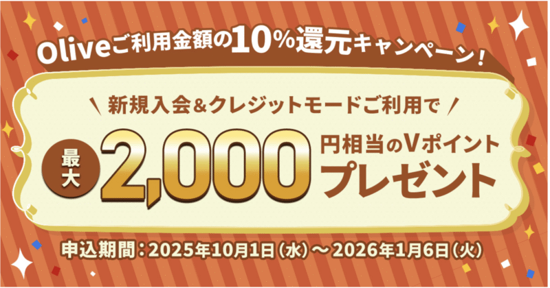 2025年10月1日(木)〜2026年1月6日(火)までの間、Oliveフレキシブルペイの新規入会とVisaタッチ決済の利用で最大2,000円がもらえるOliveご利用金額の10%還元キャンペーンが実施されています。