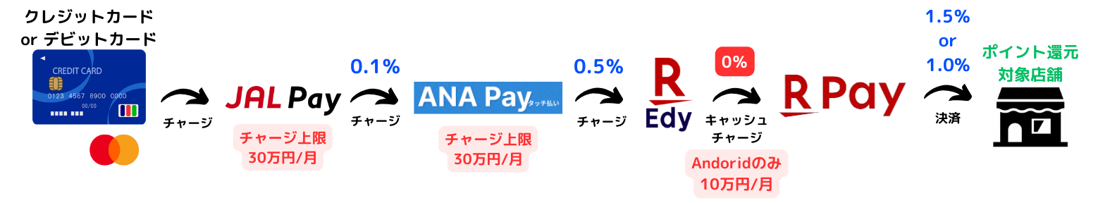 還元率+0.1%の『JAL Pay』と還元率0.5%の『ANA Pay』を利用して、楽天ペイ決済時の実質還元率をクレカ還元率 + 最大2.1%にします。