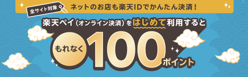 楽天ペイのオンライン決済を初めて利用すると、100Pがもらえるはじめて楽天ペイ(オンライン決済)のご利用で100ポイントプレゼントキャンペーンが実施されています。
