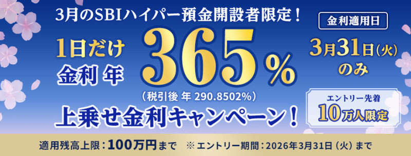 3月31日終了時点のSBIハイパー預金残高に対して、年365%(税引前)が100万円まで適用されます。