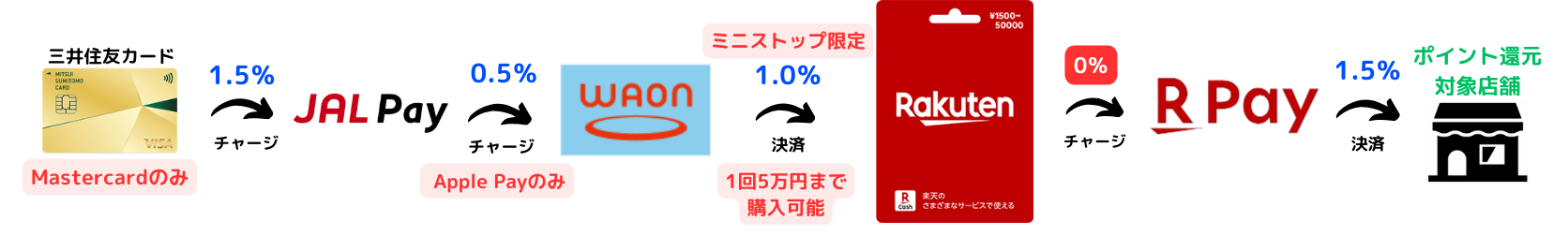 『三井住友カード(Mastercard) → JAL Pay(1.0%) → WAON(1.0%) → 楽天ギフトカード → 楽天ペイ(最大1.5%)』の決済ルートを利用することで、還元率を最大+3.5%にすることができます。