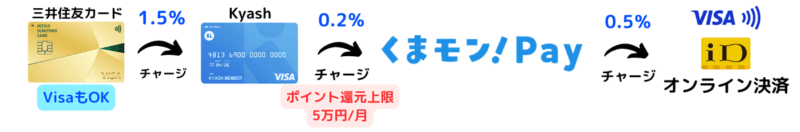 『三井住友カード(Visa) → Kyash(+0.2%) → くまモン!Pay(+0.5%)』の決済ルートを使用することで、還元率を+0.7%にすることができます。
