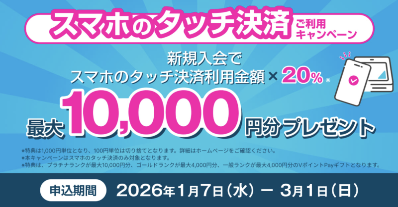 2026年1月7日(水)〜3月1日(日)までの間、三井住友カード(NL)の新規入会とVisaタッチ決済の利用で20%還元、最大4,000円 or 10,000円がもらえるスマホのタッチ決済利用20%還元キャンペーンが実施されています。